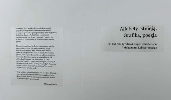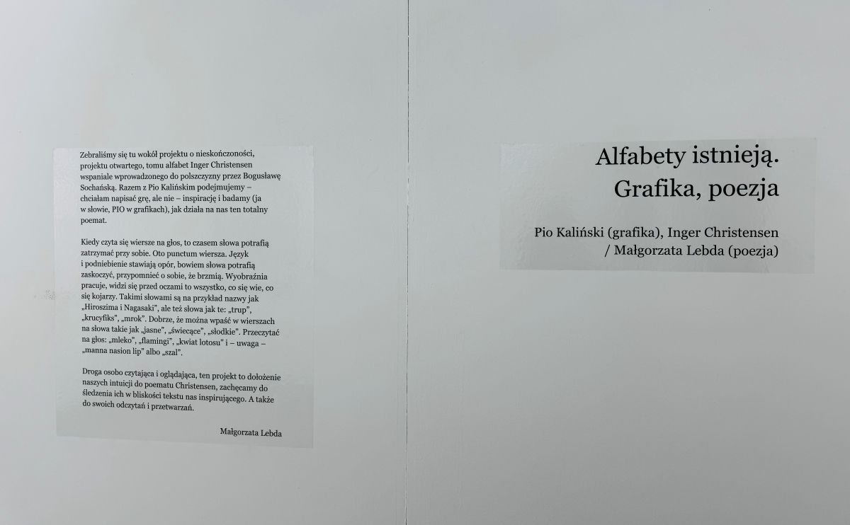 Cykl grafik Alfabety Istnieją Pio Kalińskiego powstał w inspiracji Alfabetem, tomem poezji Inger Christensen (1935-2009), jednej z najwybitniejszych duńskich poetek. Tłumaczka dzieła, Bogusława Sochańska, pisze w posłowiu do polskiego wydania: