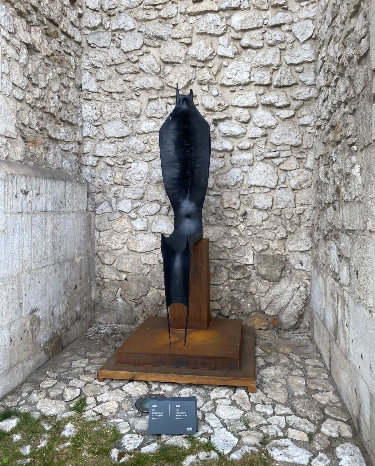 Prezentowana kolekcja rzeźb to zbiór bardzo zróżnicowany, od form ażurowych, lekkich, poprzecinanych, wydrążonych, po pełniejsze bryły z licznymi zagłębieniami i otworami przypominającymi zwielokrotnione oczodoły. Beksiński zdecydowanie nie utożsamiał rzeźby z zamkniętą formą i jednolitą bryłą, eksperymentował z jej materialnością. Hamlet to postać, a raczej dalece przetworzony wizerunek ludzkiej postaci, wyciągnięty, mocno wygięty, niestabilny i wymagający postumentu, tworzący formę tronu lub fotela. Szeroki tors stanowi naturalne oparcie, szpiczaste, zadarte do góry kolana formują kształt siedziska. Skala, smukłość postaci, zniekształcenie figury oraz czerń patyny potęgują wrażenie odrealnienia. Powierzchnia rzeźby nie jest już tak gładka jak w przypadku głów, pojawiają się żłobienia i efekt faktury. Hamlet jest przykładem dzieła abstrakcyjnego, które jest jednocześnie dziełem figuratywnym, choć dalekim od realizmu.