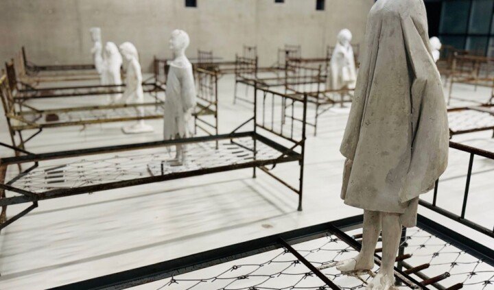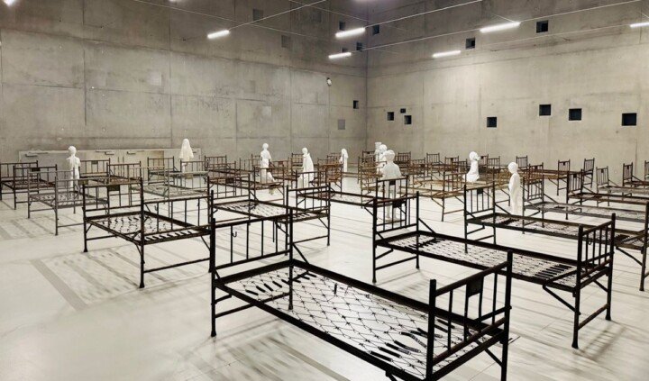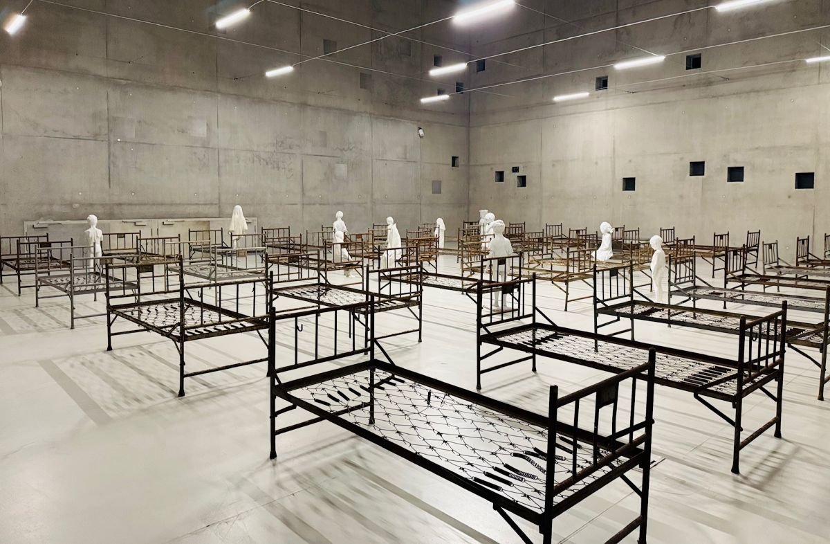 Po wejściu do Galerii jednego dzieła widzimy rzędy kilkudziesięciu starych metalowych łóżek z wojskowego szpitala polowego. Przestrzeń zaaranżowana przez Tomasza Górnickiego od razu przywołuje rozmaite wspomnienia i skojarzenia: letnie obozy, kolonie, akademiki, schroniska młodzieżowe, ale i sceny z filmów – wojennych oraz tych opowiadających o życiu w sierocińcach, internatach, domach dziecka.
