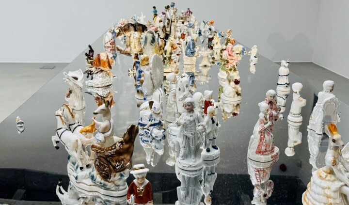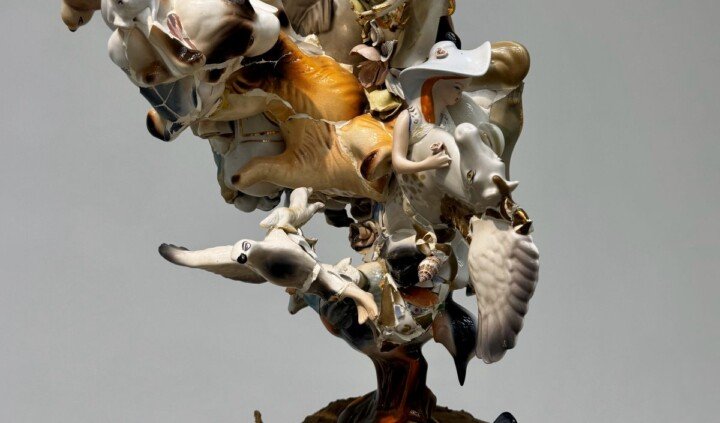Bibeloty, destrukty, potłuczone naczynia i figurki oraz muszelki przechowywane na pamiątkę, a także okazjonalne kufle, ordery i jubileuszowe trofea – to materiały, z którymi Justyna Smoleń pracuje w cyklach kolaży i ceramicznych obiektów, tworzonych od 2018 roku. Artystka wykorzystuje te przedmioty, by krytycznie przyglądać się naszym fantazmatom – mentalnym konstrukcjom, które w psychoanalizie są rozumiane jako projekcje pragnień, lęków i nieświadomych treści. Według Slavoja Žižka ich funkcja polega na maskowaniu sprzeczności i napięć wpisanych w każdą ideologię, umożliwiając ludziom zachowanie złudzenia spójności świata. Często działają jako mechanizm obronny, organizując nasze pragnienia i oferując narracje, które pozwalają uniknąć konfrontacji z realnym – traumatycznym i niemożliwym do uchwycenia aspektem rzeczywistości.