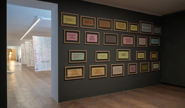 Monika Drożyńska traktuje haft jako interwencję artystyczną, aktywizm, posługiwanie się pismem w sztukach wizualnych i rozrywkę. W przestrzeni wystawy pokażemy jednak nie tylko prace wykorzystujące techniki hafciarskie, ale też przegląd jej różnorodnej i mniej znanej praktyki artystycznej – w tym przykłady projektów sztuki ze społecznością oraz praktyki fotograficznej sięgającej końca lat 90.