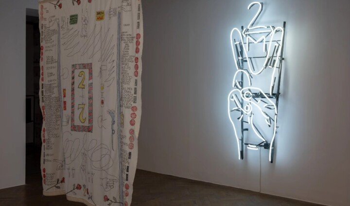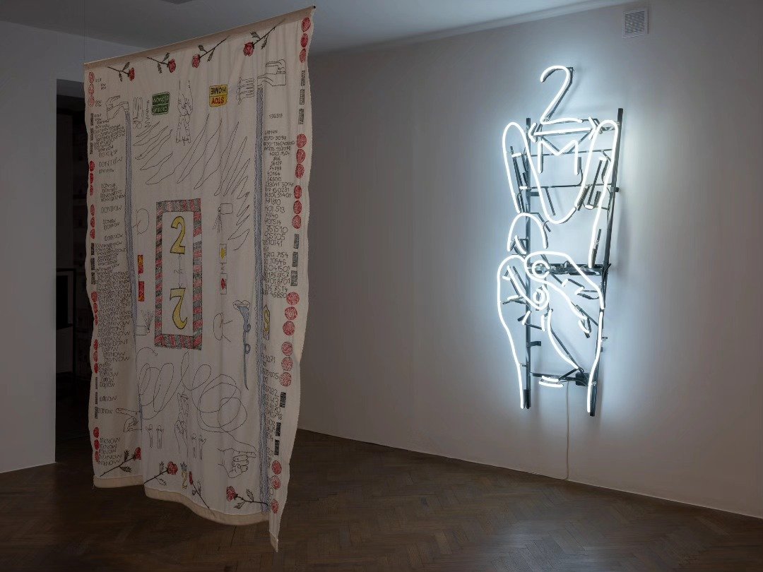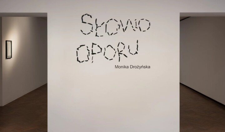 Powyższe uzasadnienie przyznania Monice Drożyńskiej nagrody Paszport Polityki w kategorii Sztuki wizualne za rok 2024 świetnie oddaje kwintesencję jej praktyki artystycznej. O twórczości Drożyńskiej trudno jest napisać coś nowego. Z jednej strony powstało już wiele świetnych tekstów analizujących jej twórczość. Z drugiej zaś, jej praktyka często brawurowo wymyka się znanym konwencjom, jednoznacznym klasyfikacjom czy utartej terminologii. Trudno jest chociażby jednoznacznie skategoryzować jej pozagaleryjną praktykę hafciarską jako sztukę w przestrzeni publicznej czy sztukę publiczną. Często plasuje się ona na przecięciu tych praktyk, czasem migruje z galerii do przestrzeni publicznej lub odwrotnie. Przykładem może być wywodzący się z cyklu „Obrusy” projekt „Oddzielone” prezentowany na wystawie „Słowo oporu”, mający postać charakterystycznej flagi, która w okresie pandemii zawisła na balkonie artystki – a następnie wędrowała solidarnie do wielu instytucji kultury i sztuki. W trudnym okresie lockdownu flagi zawisły m.in. na Biennale Warszawa, w Galerii Arsenał w Białymstoku, Galerii Miejskiej Arsenał w Poznaniu, BWA w Katowicach, Zielonej Górze, Tarnowie, Galerii Bielskiej BWA, BWA Wrocław Główny, Trafostacji w Szczecinie, Krakauer Haus w Norymberdze, w Londynie, Tel Awiwie oraz Liverpoolu. Znak victorii z flagi został następnie przeniesiony na kolportowane przez artystkę pocztówki-naklejki oraz neon3, który również jest prezentowany w Arsenale.