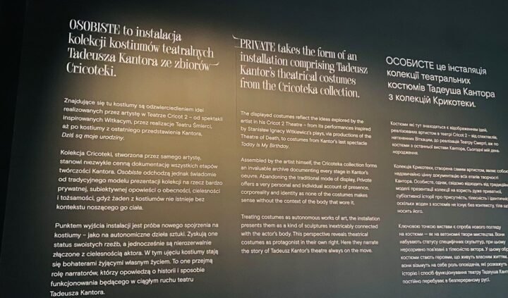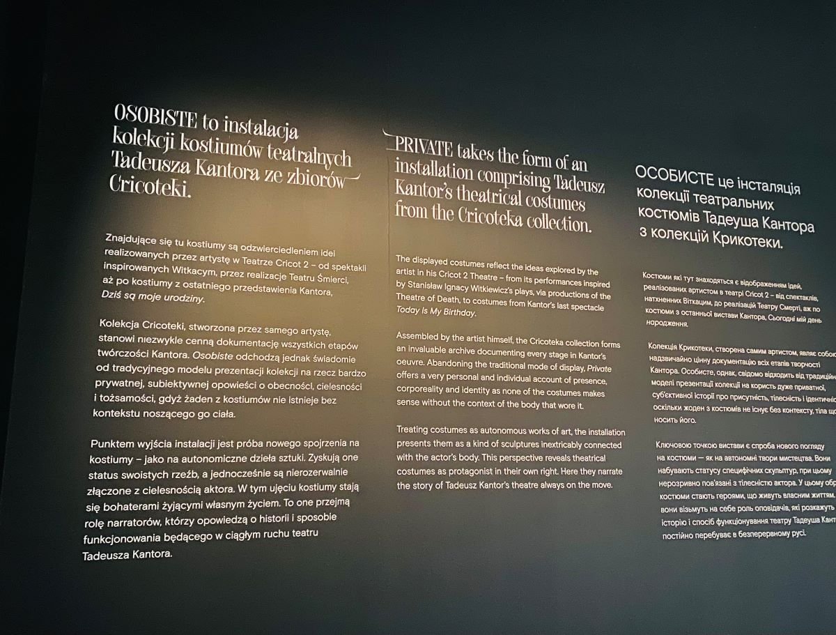 Osobiste to niekonwencjonalna, wielkoformatowa instalacja kolekcji kostiumów teatralnych Tadeusza Kantora ze zbiorów Cricoteki.