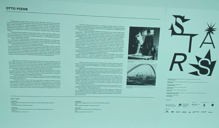 To pierwsza w Polsce indywidualna wystawa prac Ottona Piene – światowej sławy niemiecko-amerykańskiego artysty, jednego z założycieli grupy ZERO. Na wewnętrznym dziedzińcu możemy oglądać jego słynne rzeźby powietrzne Długie gwiazdy (2014) oraz instalację świetlną Praska przestrzeń światła (2002/2017).