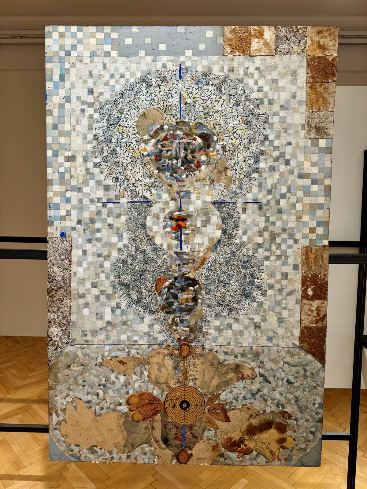 Górna przestrzeń galerii poświęcona jest problematyce widzenia z otwartymi oczami: w świetle dnia, ale i w oślepiającym świetle wybuchającego słońca, w czarnym blasku wydarzenia i doświadczenia liminalnego. Słońce w tej części wystawy, w dziełach Orzechowskiej przybiera kolor szary lub czarny, staje się ciemnym świecidłem. Kolaże takie jak By nigdy więcej oraz Nie strzelajcie do… można rozpatrywać jako twierdzenie na temat okrucieństw wojny i wskazanie na Zagładę, a zarazem jako niezgodę wobec wydarzającej się właśnie przemocy: antysemickiej i antyinteligenckiej nagonki w 1968 roku. Symbolicznie kończący wystawę kolaż przedstawia czarne słońce – przypominające gigantyczne oko wpatrzone w postępującą katastrofę świata, a zarazem przeżywające dezintegrację i śmierć podmiotowości.