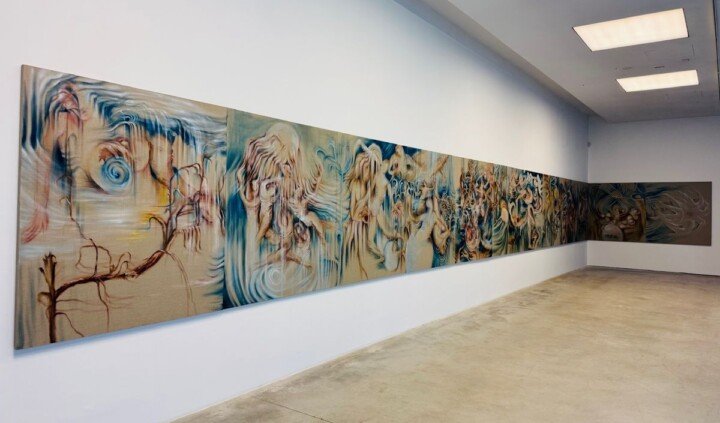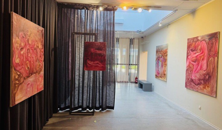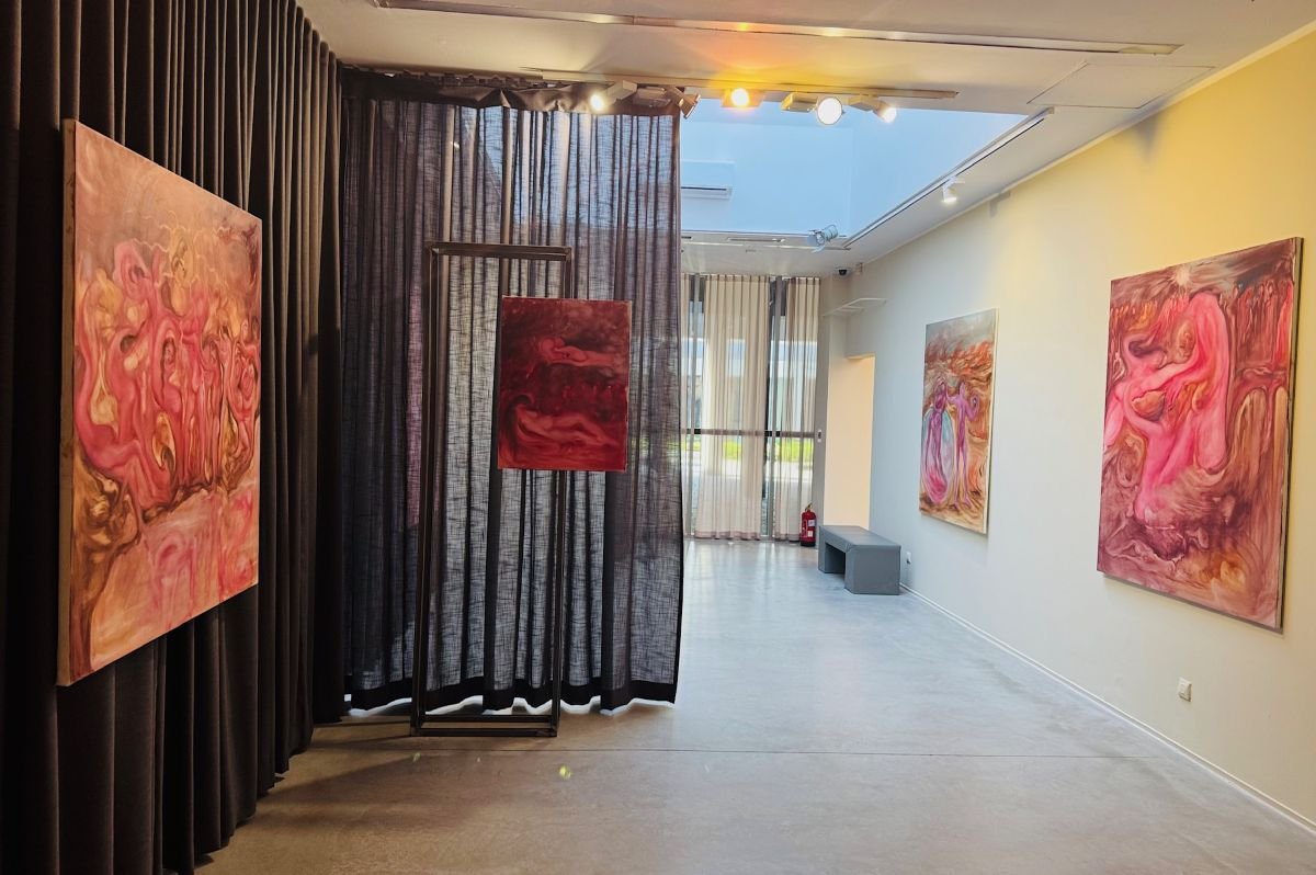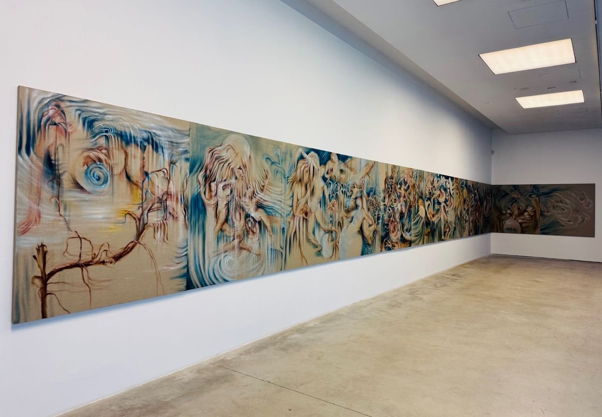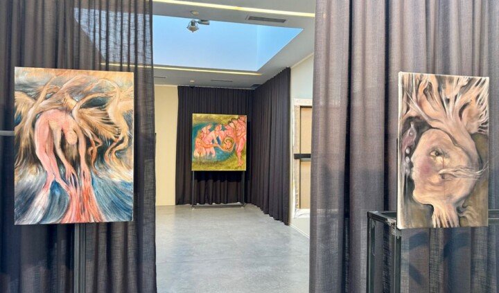 Wystawa The Rapture składa się z dwóch rozdziałów. Ekspozycja w Galerii Alfa obejmuje nowo stworzoną malarską instalację złożoną z 12 indywidualnych prac, które badają płynność tożsamości, głębokie więzi między ludźmi a ziemią oraz niezłomność ludzkiego ducha. Postacie kreowane przez Shahmuradovą Tanską znajdują się w stanie nieustannej transformacji i ekstazie, przenikając przez czas i przestrzeń, by odzwierciedlić wspólne doświadczenie kształtowane przez wrażliwość i siłę. Immersyjny, panoramiczny fryz zaprasza widzów do świata, w którym pamięć, mit i przeżycia splatają się i oferują poetycką refleksję nad przynależnością, wykorzenieniem i przetrwaniem. Fryz The Rapture łagodnie wpisuje się w architekturę wnętrza muzeum, w niemal mistyczny sposób nawiązując relację z przyrodą pobliskiego ogrodu.