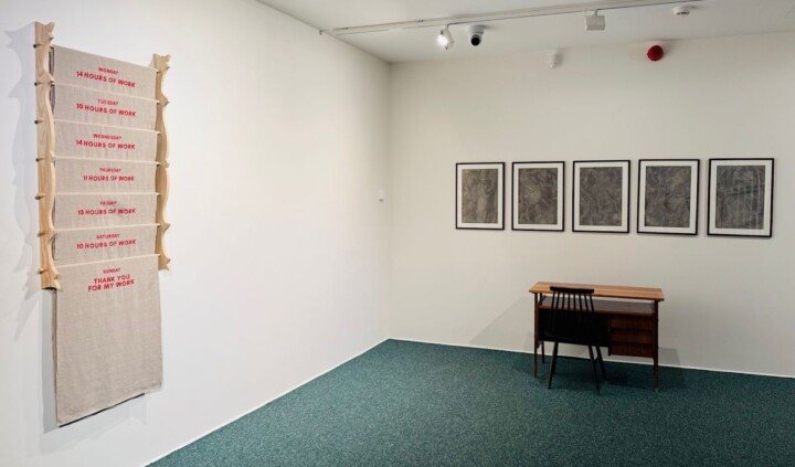 Wystawa Thank you for my work podejmuje temat konceptualizacji pracy artystycznej, akcentując zarówno jej specyfikę, jak i aspekty łączące przedstawicieli zawodów kreatywnych z reprezentantami innych grup zawodowych. Punkt wyjścia stanowią dzieła wpisujące się w nurt krytyki instytucjonalnej (Andrea Fraser, Hubert Czerepok, Laura Pawela), za sprawą którego kondycja osób artystycznych stała się istotnym tematem w dyskursie sztuki ostatnich dekad XX wieku. Przyglądając się wątkom związanym z pracą artystyczną w twórczości młodszego pokolenia artystek i artystów (m.in. Ala Savashevich, Katarzyna Wójcicka, Iza Tarasewicz, Tomek Kręcicki), wystawę odczytywać można jako obszar namysłu nad kwestiami takimi jak nienormowany czas pracy, kompulsywne myślenie o pracy, przepracowanie, próba pogodzenia pracy zarobkowej z pracą artystyczną czy poszukiwanie balansu między życiem zawodowym a życiem prywatnym.