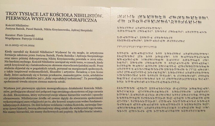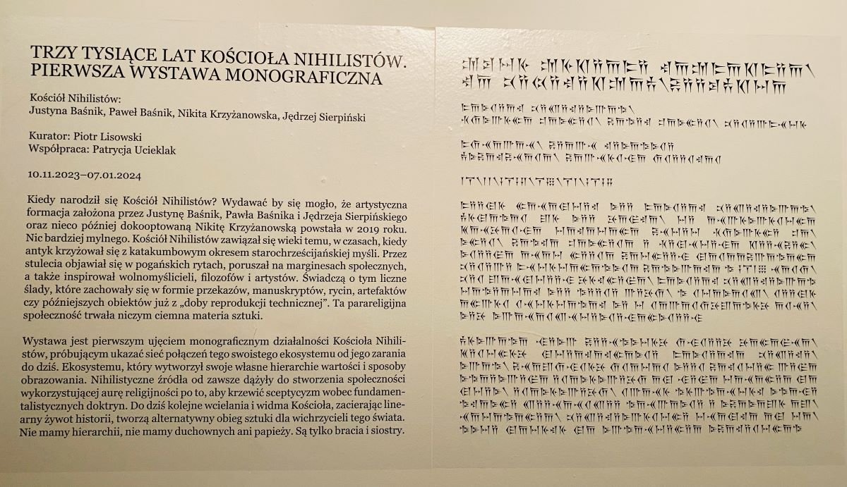 Wystawa jest pierwszym ujęciem monograficznym działalności Kościoła Nihilistów, próbującym ukazać sieć połączeń tego swoistego ekosystemu od jego zarania do dziś. Ekosystemu, który wytworzył swoje własne hierarchie wartości i sposoby obrazowania. Nihilistyczne źródła od zawsze dążyły do stworzenia społeczności wykorzystującej aurę religijności po to, aby krzewić sceptycyzm wobec fundamentalistycznych doktryn. Do dziś kolejne wcielania i widma Kościoła, zacierając linearny żywot historii, tworzą alternatywny obieg sztuki dla wichrzycieli tego świata. Nie mamy hierarchii, nie mamy duchownych ani papieży. Są tylko bracia i siostry.