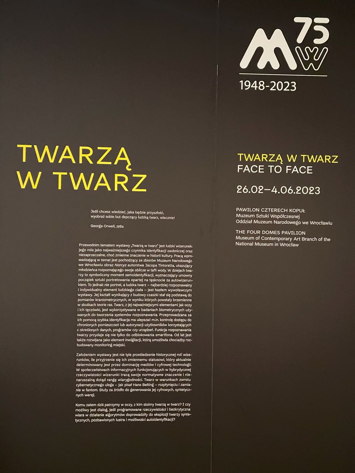 Twarz – najłatwiej rozpoznawalny, najbardziej wyeksponowany i tym samym najbardziej wrażliwy element ciała człowieka – jest tematem najnowszej wystawy czasowej w Pawilonie Czterech Kopuł. Pokazane zostały prace ponad dwudziestu artystów z całego świata. Dlaczego, dla kogo i w jaki sposób ludzie na przestrzeni wieków rejestrowali wizerunki własne i cudze? Jakie zagrożenia dla wizerunku niosą dziś rozwój cyfryzacji, cybernetyki i bezkrytyczne korzystanie z nowoczesnych technologii?
