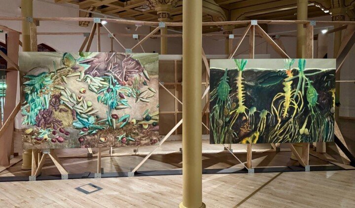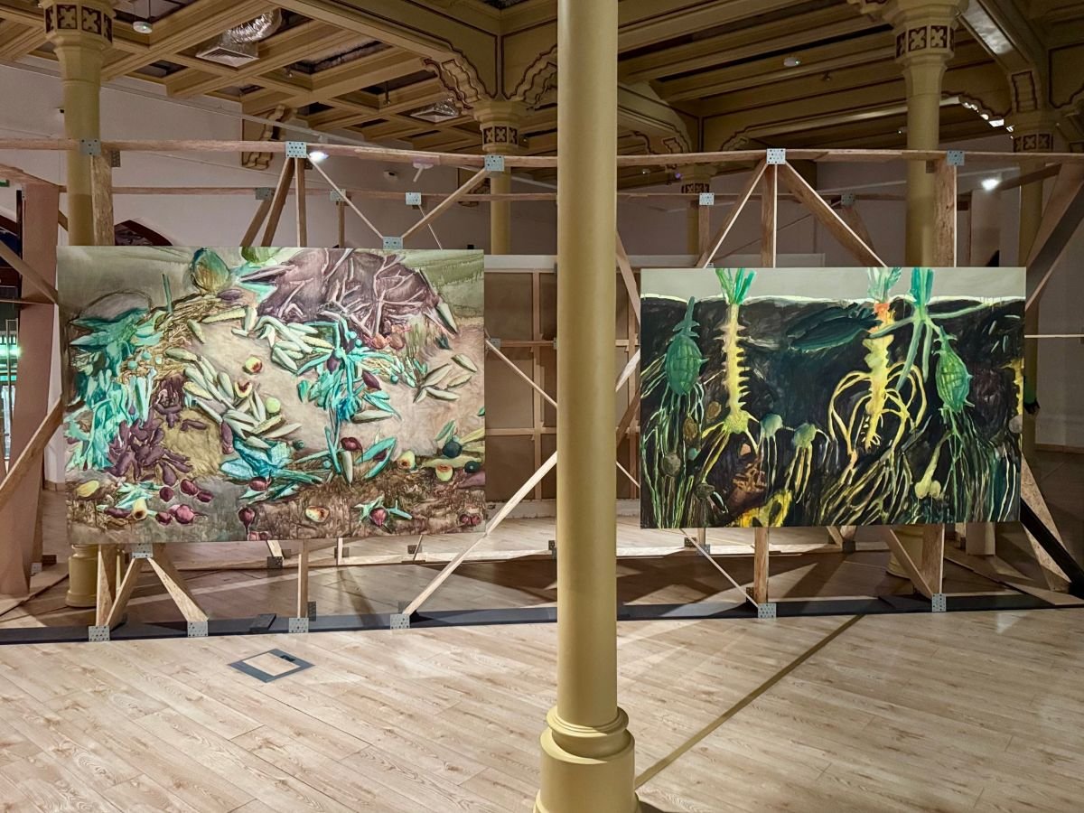 Wystawa w pierwszej części skupia się na prowadzonych przez twórców i twórczynie badaniach nieodwracalnych zmian i zbrodni dokonanych na rodzimym krajobrazie w trakcie rosyjskiej inwazji. Z wykorzystaniem narzędzi artystycznych dokumentują oni i one akty ekobójstwa, takie jak skutki wysadzenia przez Rosjan tamy i elektrowni w Nowej Kachowce w 2023 roku. Źródeł ingerencji w pejzaż dopatrują się już w okresie Związku Socjalistycznych Republik Radzieckich, kiedy intensywna industrializacja wschodnich terenów Ukrainy objęła uprzemysłowienie stepów czy regulację Dniepru. Artystki i artyści tworzą zielniki, a przez mikroskopy przyglądają się mchom i porostom występującym na zagrabionych ziemiach.